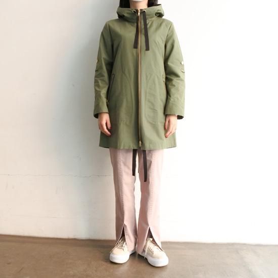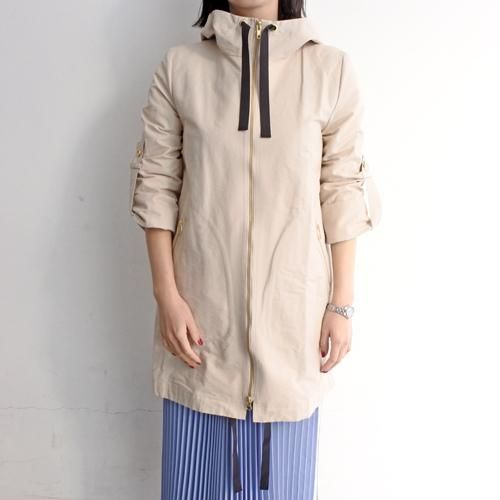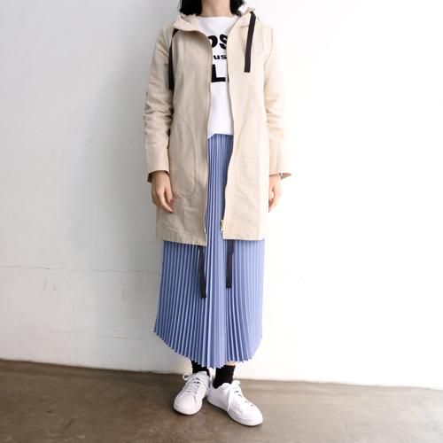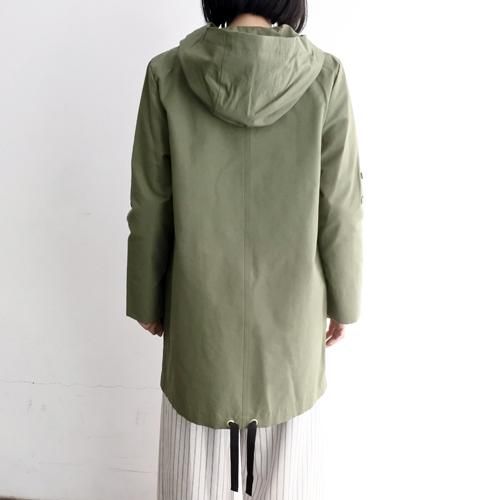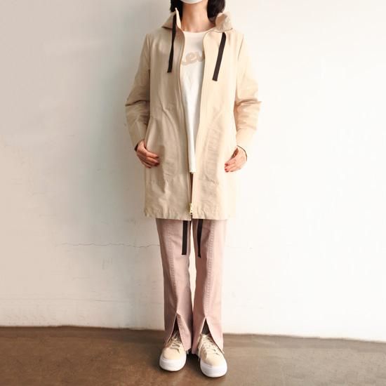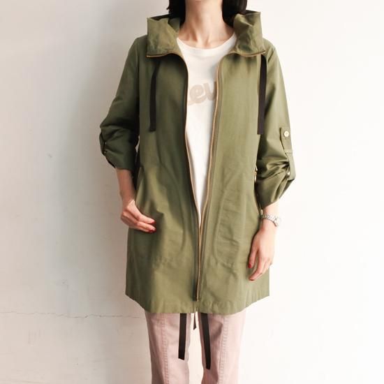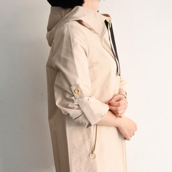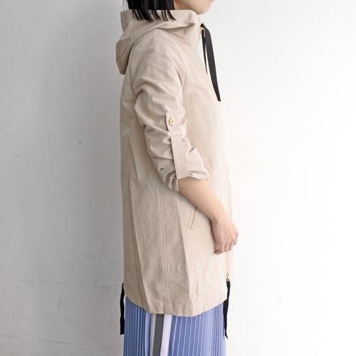 ディテールは、首元をスタンドにし、首と裾のリボンで縦のラインを作ることで、より一層すっきり見せてくれ、子供っぽくなりがちなフードコートを、大人で上品なシルエットに仕上げくれています。袖をロールアップしても着られるので梅雨の時期もバッチリですね!